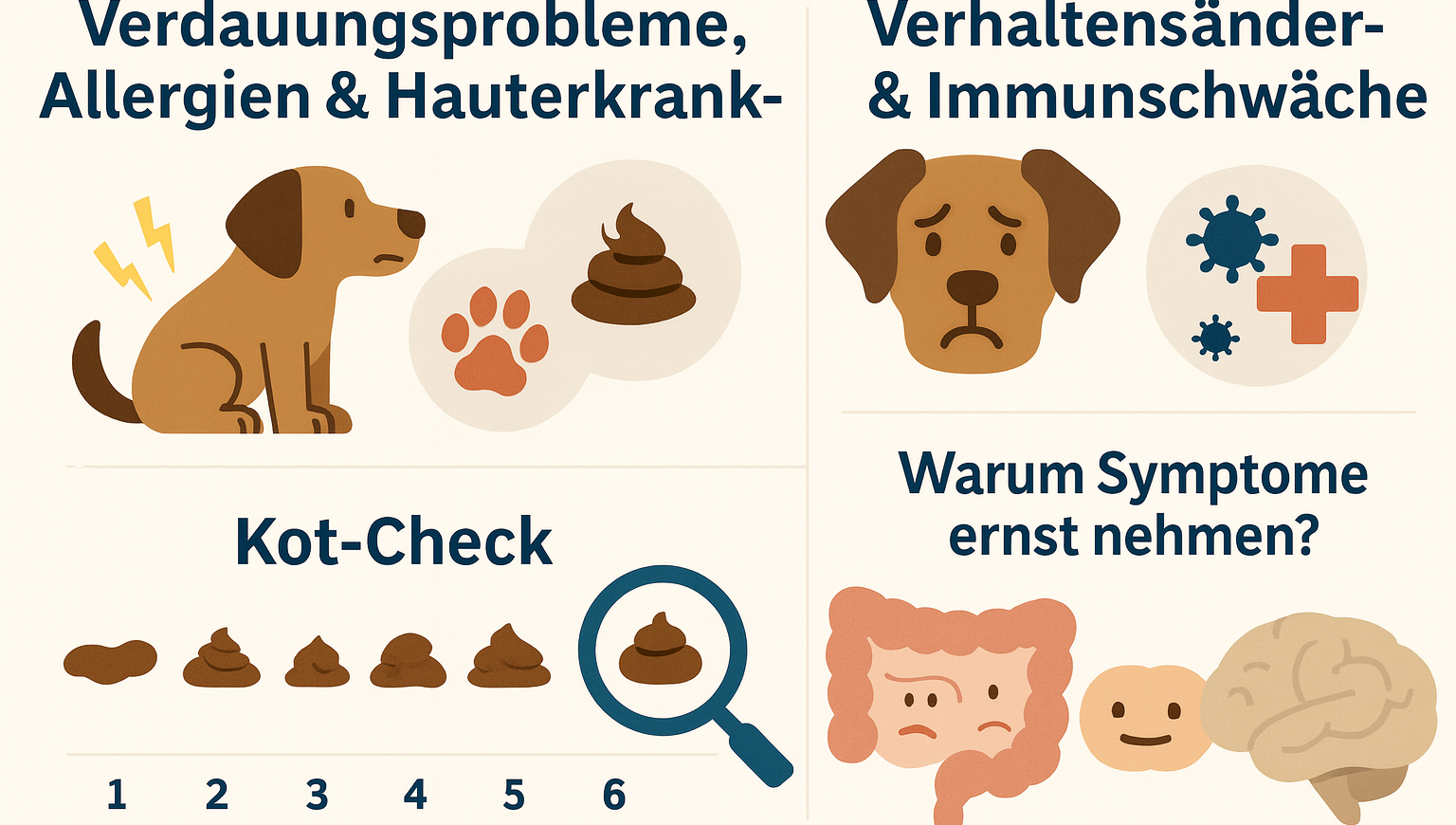 Im 4. Teil unserer Mikrobiom-Serie erfährst du, welche Symptome auf eine gestörte Darmflora beim Hund hindeuten. Von Verdauungsproblemen und Hauterkrankungen über Verhaltensänderungen bis hin zu Immunschwäche – inklusive Kot-Check und Checkliste, wann ein Tierarztbesuch nötig ist.