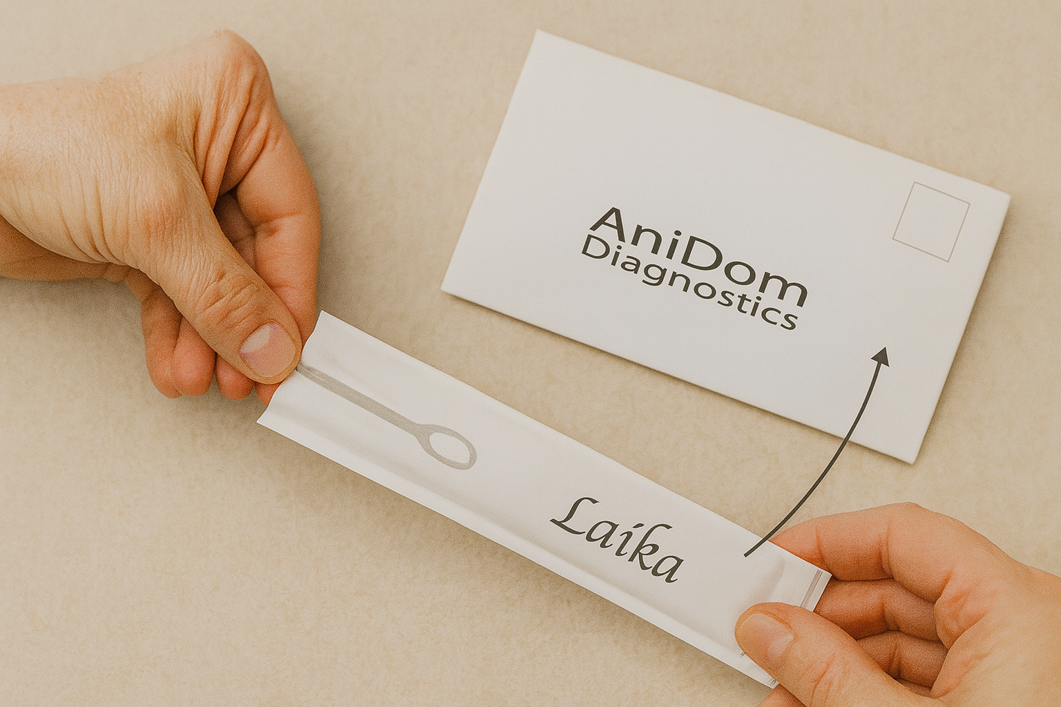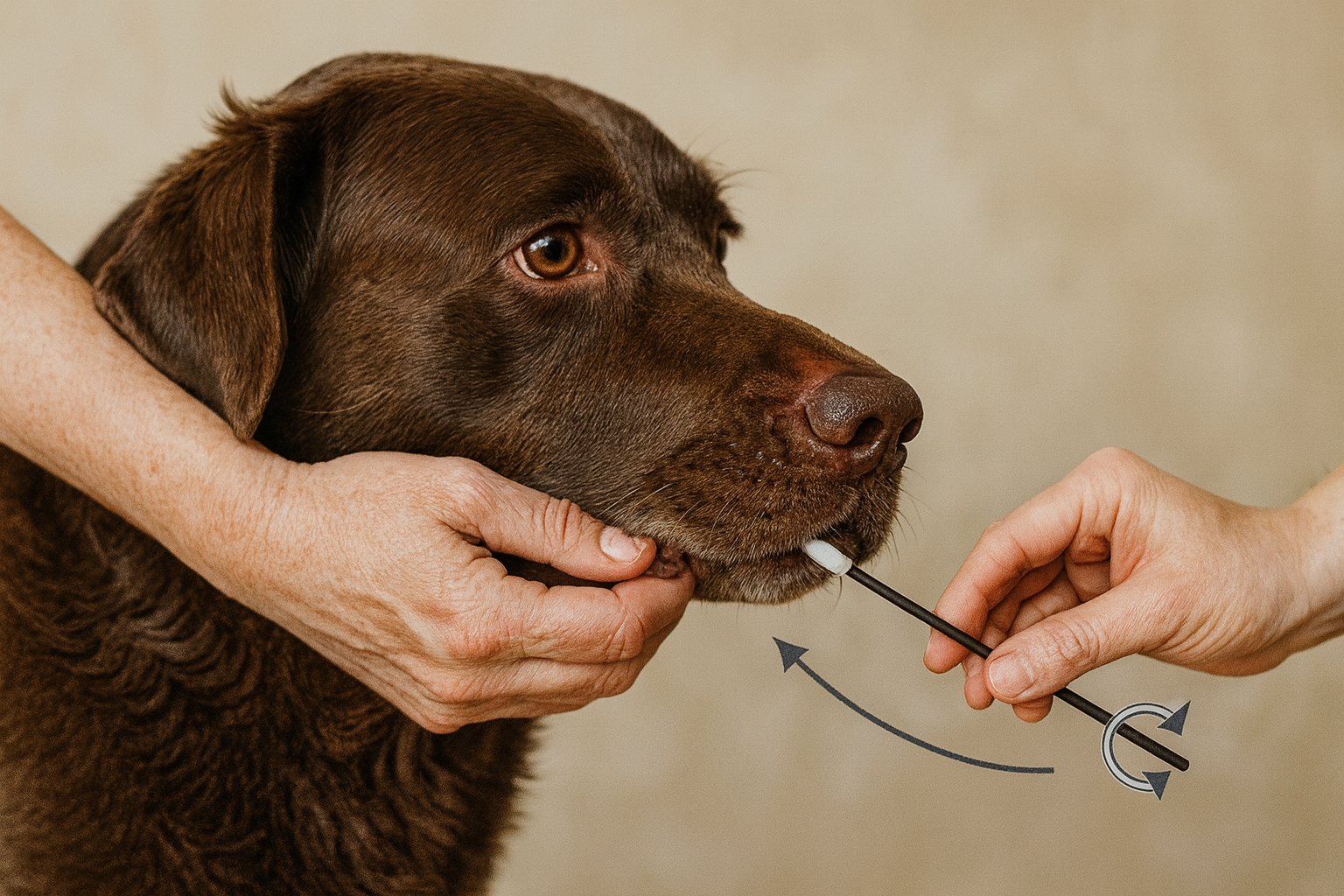 Mit dem Tupfer aus dem Testkit kannst du ganz einfach und für deinen Hund völlig schmerzlos selbst eine Speichelprobe von ihm nehmen. Wie du am besten vorgehst, zeigt dir die beiliegende Testanleitung.