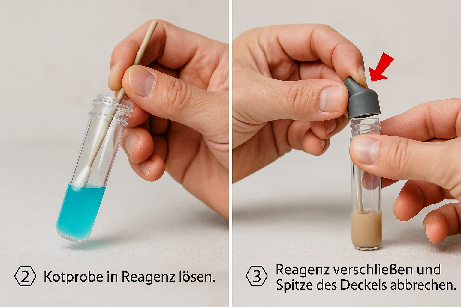 Kotprobe im Reagenz des mitgelieferten Probenröhrchens lösen.