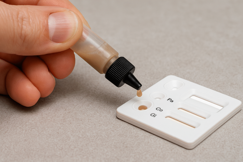 Bei entsprechenden Symptomen wie Durchfall, Erbrechen oder Fieber kann mit diesem Test sehr frühzeitig eine Infektion mit Parvoviren (CPV/FPV) oder Coronaviren (CCV/FCoV) oder ein Parasitenbefall mit Giardien erkannt werden. Dazu wird eine kleine Menge des Kots in einer Flüssigkeit verdünnt und auf einen Teststreifen gegeben. So einfach wie bei einem Schwangerschaftstest erkennt man dann bei Erscheinen der Testlinie, ob eine Infektion und / oder ein Parasitenbefall vorliegen.