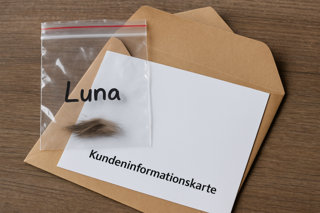 Verpacke die Haarprobe zusammen mit der Kundeninformationskarte in einem sicheren und ausreichend frankierten Umschlag